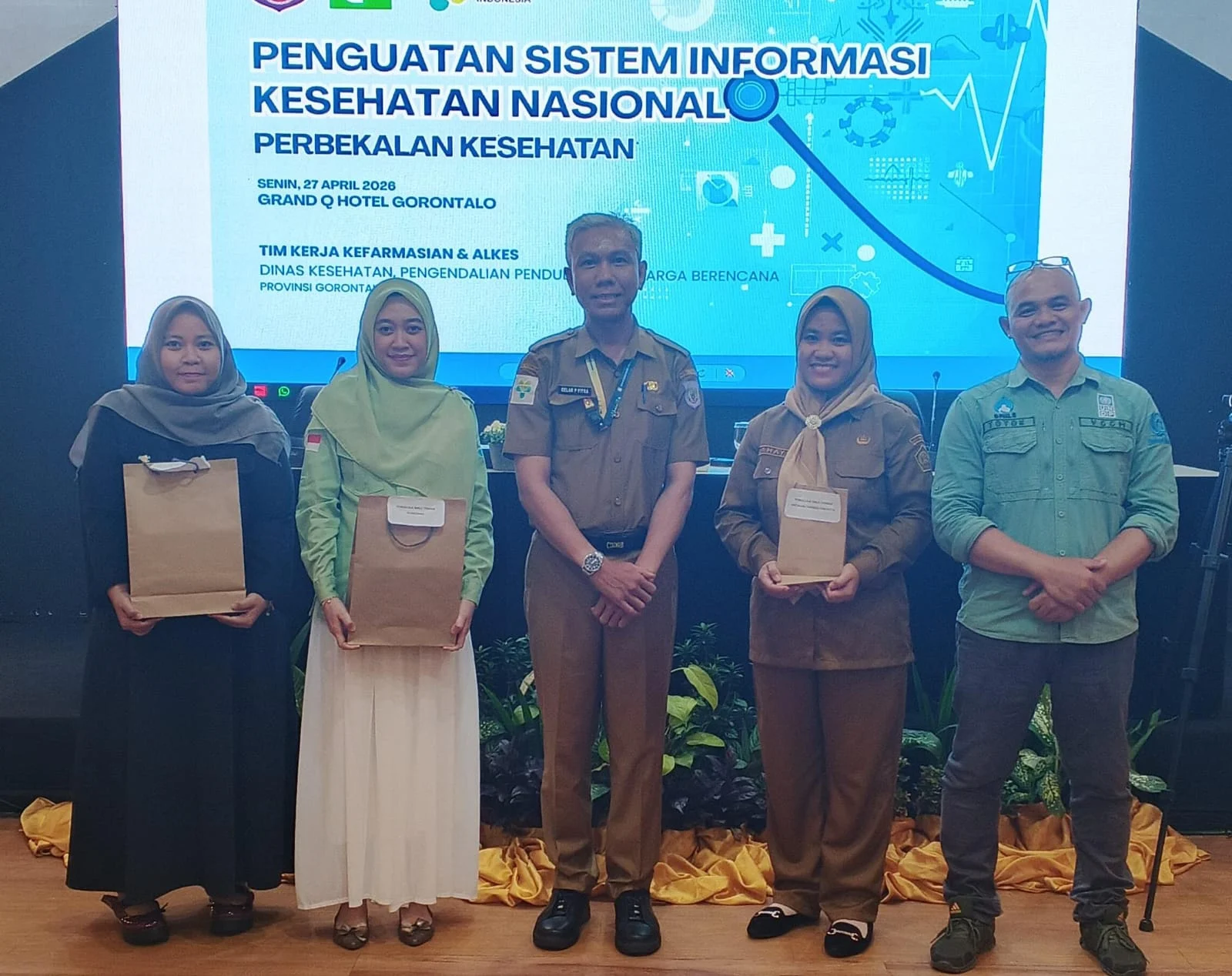 Penghargaan tersebut diserahkan dalam kegiatan Penguatan Sistem Informasi Kesehatan Nasional Perbekalan Kesehatan yang diselenggarakan oleh Dinas Kesehatan, Pengendalian Penduduk dan Keluarga Berencana (Dinkes P2KB) Provinsi Gorontalo, bertempat di Grand Q Hotel, pada Senin (27/04/2026).