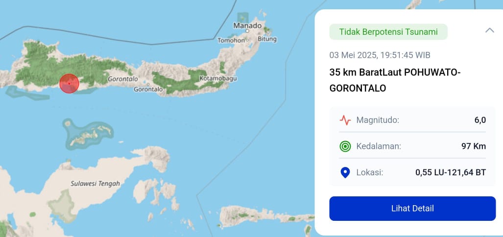 Poota.id, Gorontalo – Gempa bumi berkekuatan magnitudo 6,0 mengguncang wilayah barat laut Kabupaten Pohuwato, Provinsi Gorontalo, pada Sabtu malam (3/5/2025) pukul 19:51 WIB. Badan Meteorologi, Klimatologi, dan Geofisika (BMKG) dilansir dari laman resminya, melaporkan bahwa pusat gempa berada pada koordinat 0.56° Lintang Utara dan 121.68° Bujur Timur, dengan kedalaman 90 kilometer.