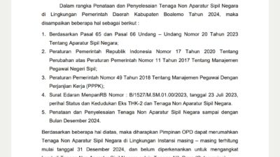 Dalam edaran tersebut, menyatakan bahwa Pimpinan OPD dapat merumahkan Tenaga Non ASN di Lingkungan Instansi masing-masing terhitung mulai tanggal 31 Desember 2024.