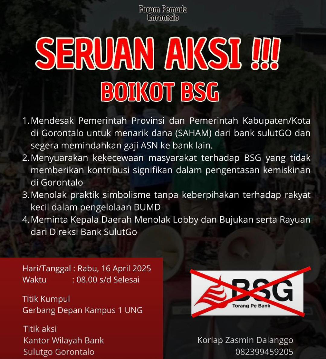 Poota.id, Gorontalo — Forum Pemuda Gorontalo akan menggelar aksi demonstrasi besok Selasa 15 April. Aksi tersebut sebagai bentuk penolakan terhadap manuver politik yang dilakukan oleh Bank SulutGo (BSG) terhadap pemerintah daerah di Gorontalo. Aksi ini digelar di sejumlah titik strategis, termasuk Kantor Wilayah BSG.
