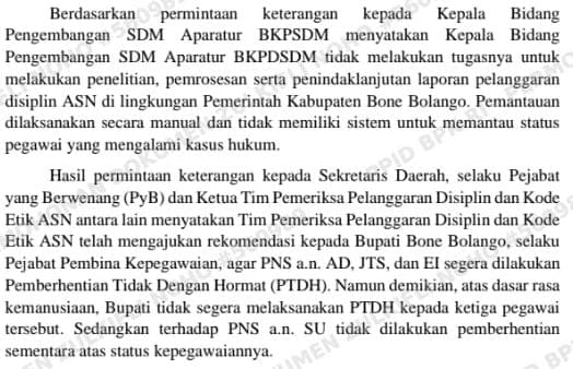 Bupati Bone Bolango saat itu tidak menjalankan rekomendasi Sekda selaku Ketua Tim Kode Etik ASN. Rekomendasi tersebut meminta agar beberapa ASN berinisial A.D, J.T.S, dan E.I dikenakan hukuman Pemberhentian Tidak dengan Hormat (PTDH). Namun, keputusan itu tidak dijalankan dengan alasan “kemanusiaan”. Begitu juga dengan ASN berinisial S.U yang seharusnya diberhentikan sementara, tetapi tetap dibiarkan.