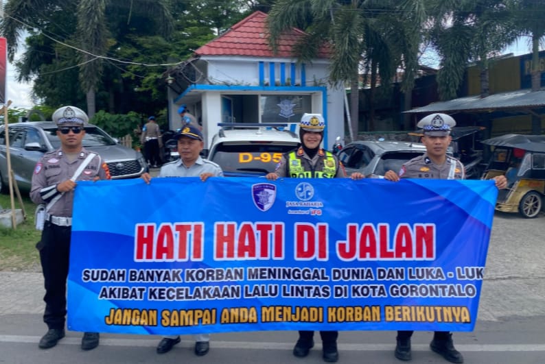 Poota.id, Gorontalo – Ada yang berbeda di kawasan Simpang Lima Telaga, Kota Gorontalo, Rabu pagi (25/6/2025). Dalam semangat peringatan Hari Ulang Tahun (HUT) Bhayangkara ke-79, Satuan Lalu Lintas (Satlantas) Polresta Gorontalo Kota bersama PT Jasa Raharja menggelar aksi simpatik bertajuk edukasi keselamatan lalu lintas.
